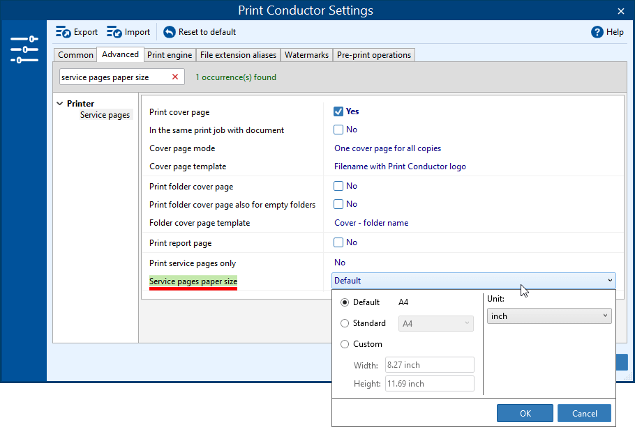 Please note that changing paper size via Service pages paper size setting will affect both report pages and cover pages.